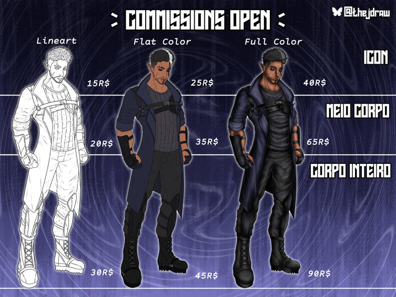 Opa! Sou conhecido por @The_JDraw nas redes sociais, mas pode me chamar de Jota. Sou um artista freelancer dedicado a arte de personagem. Aqui você pode ver as informações mais relevantes sobre as minhas encomendas. Fique a vontade para me mandar uma mensagem!
